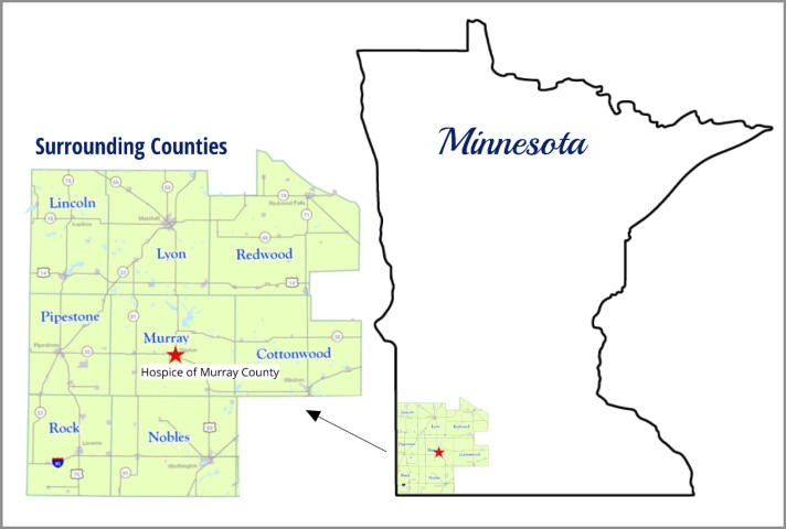 Hospice of Murray County is based in Slayton but is proud to serve other Southwest Minnesota counties within 40 miles including portions of Cottonwood, Nobles, Lyon, Pipestone, Lincoln, Rock, and Redwood Counties.